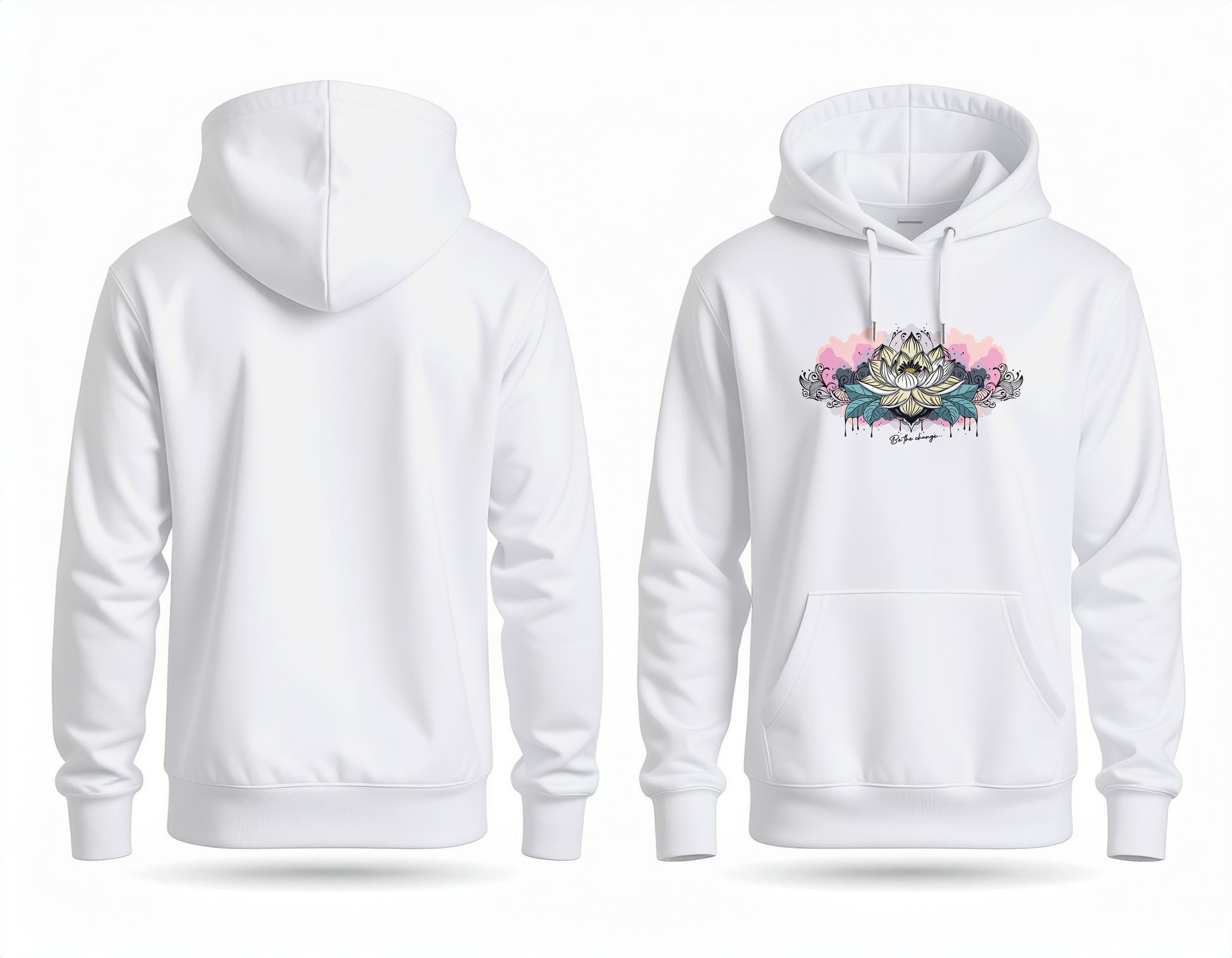 Geworteld in vrede, bloeiend met doel. De "Be the Change" hoodie combineert kunst en intentie met een prachtig gedetailleerd lotusontwerp tegen zachte roze en blauwe inktachtige spatten. In het midden symboliseert de heilige lotus groei door strijd - boven de modder uitstijgen om schoonheid, helderheid en rust te delen.