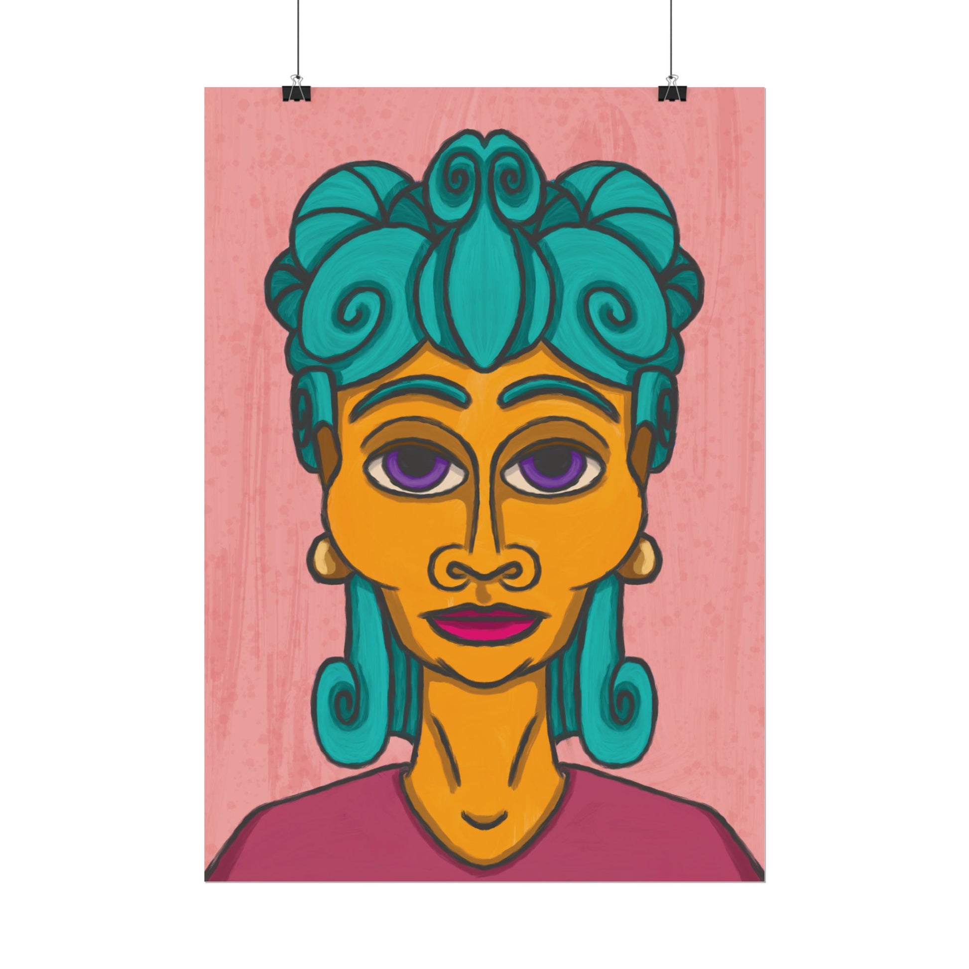 Handgeschilderd digitaal olieverfschilderij - "Agoy" Een abstract portret met gedurfde, opvallende kleuren die tot de verbeelding spreken. Dit stuk draagt een serene maar krachtige mystiek en nodigt je uit voor een avontuurlijke reis naar de onbekende landschappen van de geest.