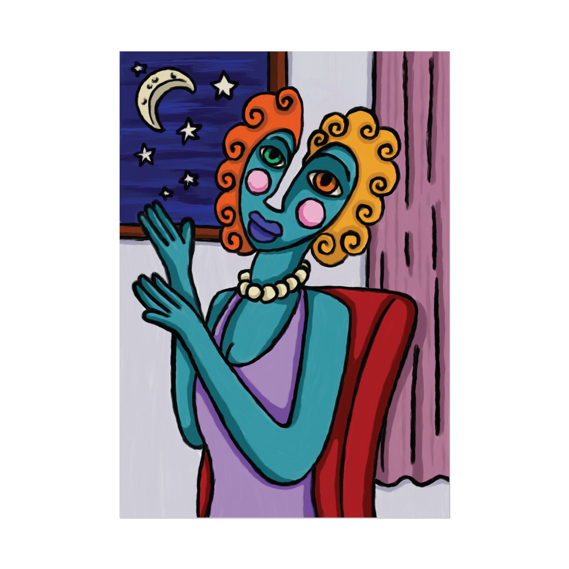 Handgeschilderd digitaal olieverfschilderij – Stargazer. Gedurfd, grillig en vol persoonlijkheid - dit kunstwerk is geïnspireerd op modernistische portretten en geeft er een speelse draai aan. Met zijn opvallende kleuren, abstracte proporties en dromerige expressie legt het de schoonheid vast van de verbeelding die naar de nachtelijke hemel staart.